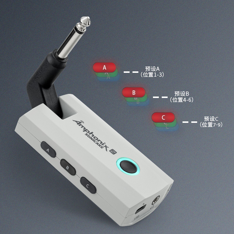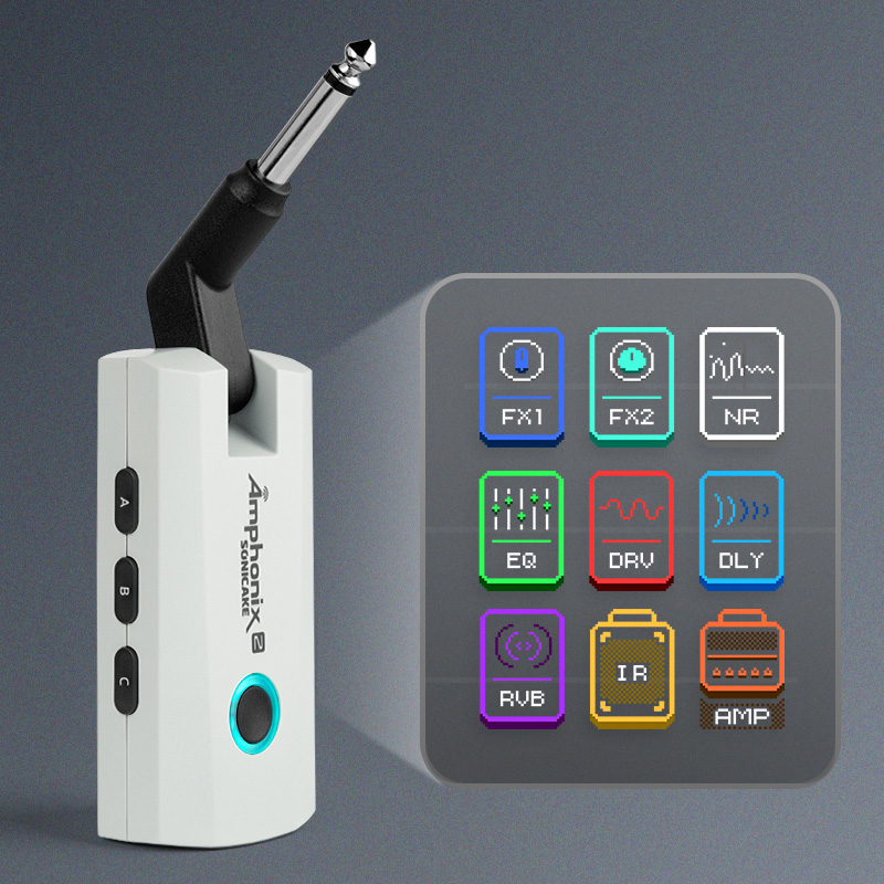 Amphonix 2是Sonicake最新的智能插琴效果器。本品外观设计精美,兼顾便携、实用性,操作直观简单、连接方便、功能强大、音质清晰,是您居家练习或演奏创作的好帮手。该产品可通过BT连接播放音频,内置多种高品质吉他效果;附带APP上位机,可进行精细调节;支持USB、Audio、手机OTG,连接手机可直接进行内录;快捷的预设按键及内置锂电池,可满足户外演奏、家用练琴的需求。